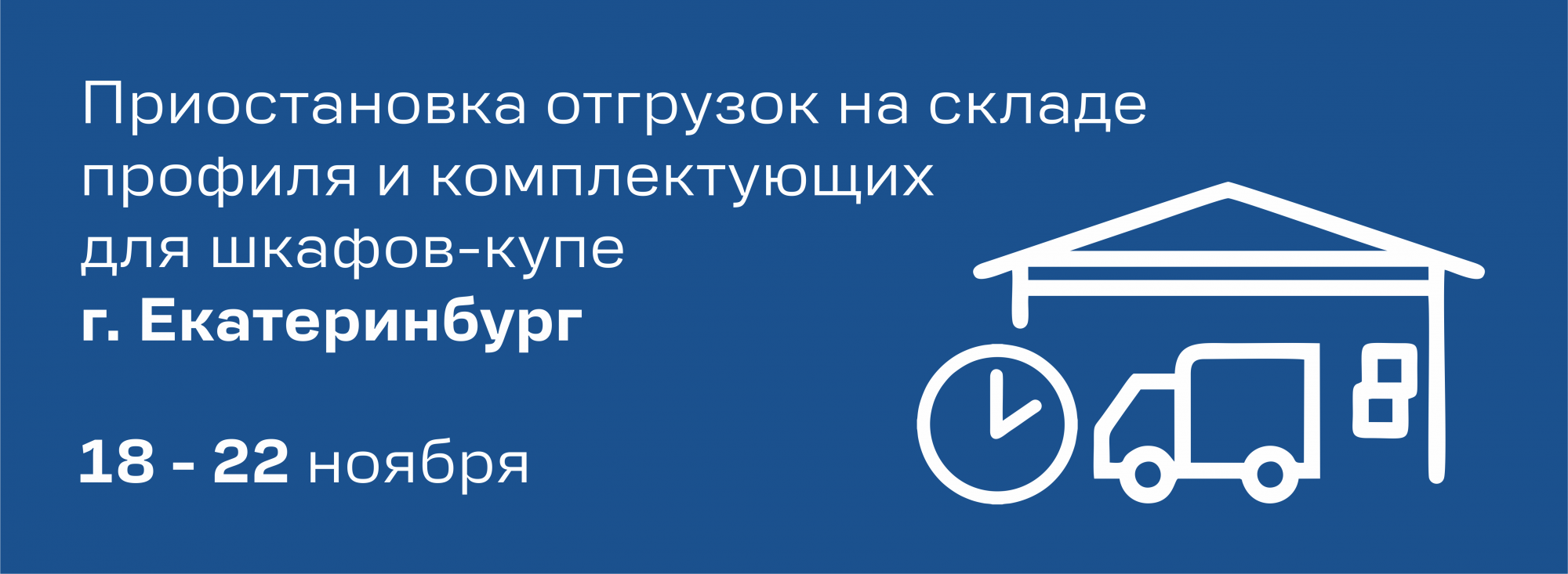 Информируем вас о приостановке отгрузок в период с 18 по 22 ноября в связи с проведением плановой инвентаризации товара на складе профиля и комплектующих для шкафов-купе.